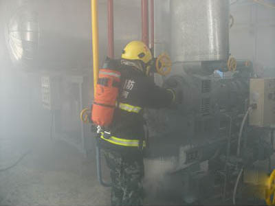 當(dāng)氨制冷系統(tǒng)發(fā)生漏氨事故時,相關(guān)人員切不可慌不擇路的選擇自我逃生。當(dāng)班操作人員要沉著鎮(zhèn)靜,以免亂開或錯開機器設(shè)備上的閥門,導(dǎo)致事故進(jìn)一步擴大。迅速報警,撤離疏散污染區(qū)人員至上風(fēng)處,并立即隔離150M,嚴(yán)格限制閑雜人員出入。必須正確判斷情況,組織有經(jīng)驗的技工進(jìn)入現(xiàn)場搶救。處理人員必須佩戴正壓式呼吸器,穿防毒服。戴好防護人員進(jìn)入現(xiàn)場,在水壓防護下處理泄漏點。關(guān)閉閥門或加密封等。在整個氨制冷系統(tǒng)中及時發(fā)現(xiàn)漏氨部位,做到早發(fā)現(xiàn),早處理。如是高壓管道泄漏,應(yīng)立即停止壓縮機運行,切斷漏氨部位與系統(tǒng)連通的管道。若管道不長,可采用放空的辦法,待管內(nèi)余氨放完,并置換后進(jìn)行補焊。如低壓管道(如冷庫內(nèi)冷卻設(shè)備)漏氨,應(yīng)迅速查明漏點,關(guān)閉其供液閥。由于庫房氨汽甚濃,可開風(fēng)機排除,并用酸酸溶液噴霧中和。若條件允許,可啟動壓縮機將該冷卻設(shè)備內(nèi)氨液抽回。操作人員可根據(jù)制冷系統(tǒng)不同特點和具體情況,采取靈活、安全、有效的處理方法。