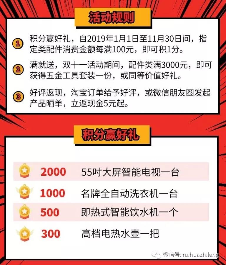 2. 滿就送,雙十一活動(dòng)期間,配件類(lèi)滿3000元,即可獲得五金工具套裝一份,或同等價(jià)值好禮。
