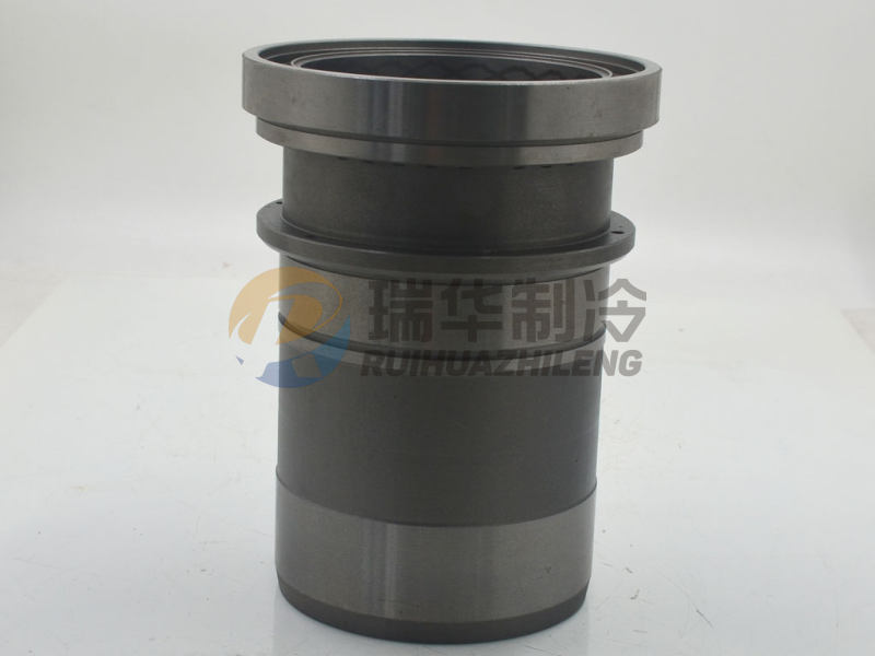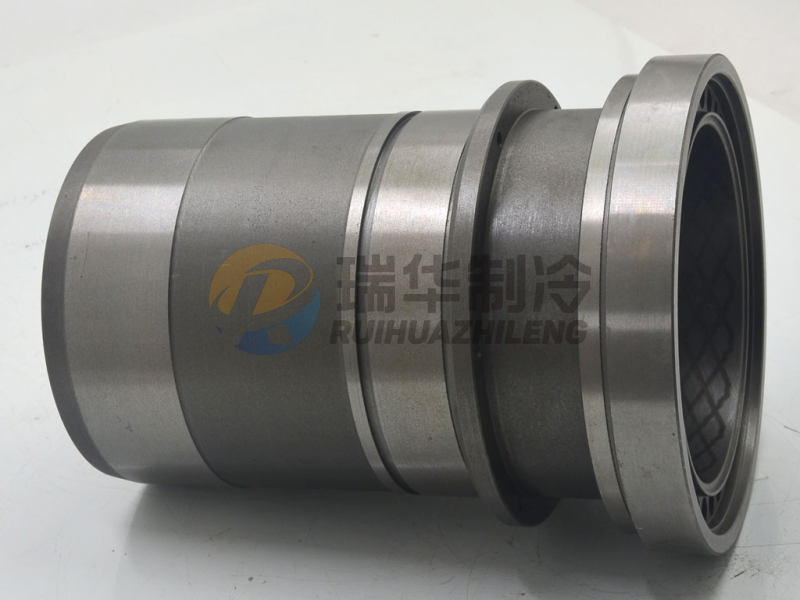 缸套的上部法蘭同時(shí)又是吸氣閥閥座,閥座座面低于法蘭的上端面,這個(gè)差距決定于吸氣閥片的厚度和升程;法蘭上有30個(gè)圓孔--吸氣孔口,它與吸氣腔相連。其中還有6個(gè)略小等角布置的圓孔可以通過頂開吸氣閥片的小頂桿,中部有能量調(diào)節(jié)用的轉(zhuǎn)動(dòng)環(huán)和檔環(huán)槽。